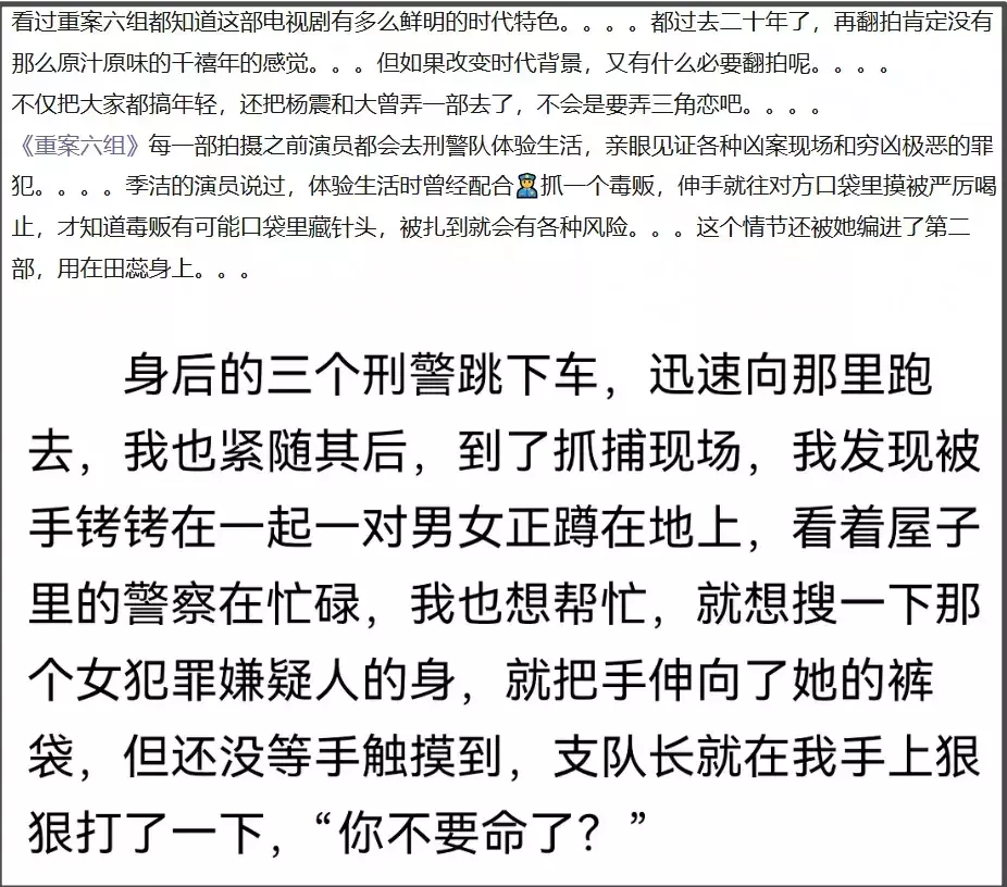 还记得《重案六组》是四部吧?除了女主季洁贯穿始终,其他角色都是轮番出场,结果翻拍版《重案六组》把不同时间出场的角色都捏到同一部里,还把包括季洁在内的角色都改年轻了。