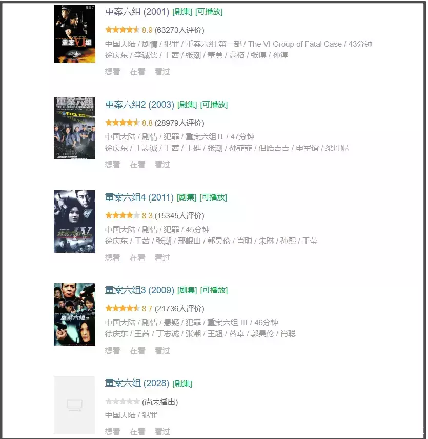虽然二创热度不及其他经典剧集,但《重案六组》堪称一代人刑侦剧启蒙,从2001年《重案六组》第一部播出,到2011年《重案六组》第四部完结,《重案六组》四部曲跨越10年,每一部评分都在8分以上。