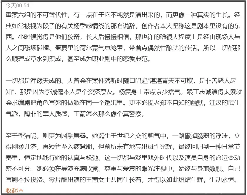 更难得的是《重案六组》成功在大女主和群像剧之间做到了平衡,当《重案六组》翻拍消息传出来的时候,绝大部分网友第一反应都是没有人能演好季洁。